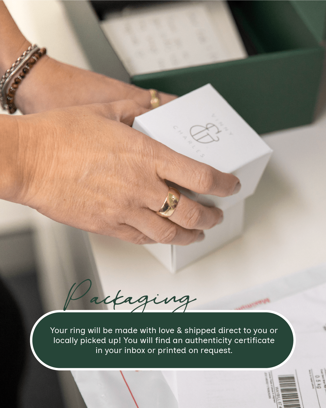 We ordered the patterned and diamond leaf wedding rings and are incredibly happy with how they look! Although we had to make a correction to the shipping address, the staff at Vinny & Charles were very helpful and responsive. We had a great experience and we highly recommend them.